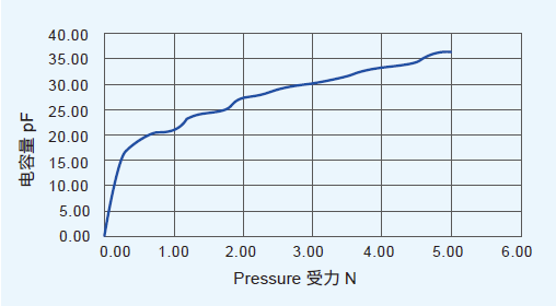 根據(jù)公式C=εS/4kπd,F(xiàn)變化引起S和d變化,導致C變化, 形成力F與C的對應關系。 產(chǎn)品性能 尺寸:1.8x1.8x0.40 mm 最大工作壓力:5N 破壞壓力:10N 施加0~5N,電容變化范圍0~35 pF 產(chǎn)品尺寸可根據(jù)客戶要求訂做 壓力傳感器電容隨受力變化曲線