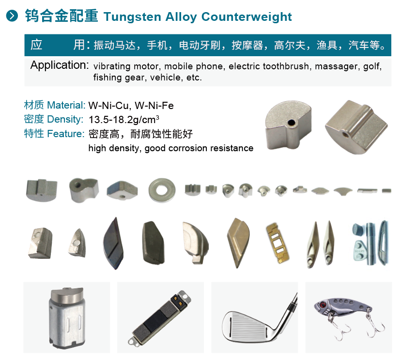 高比重合金主要運(yùn)用于機(jī)械用的平衡錘,配重桿,飛鏢桿,高爾夫球配重塊,手機(jī)、游戲機(jī)振子,航空航天的陀螺儀, 鐘表擺錘,醫(yī)療器械,高比重電觸點(diǎn),軍用穿甲彈,子母彈等等。
